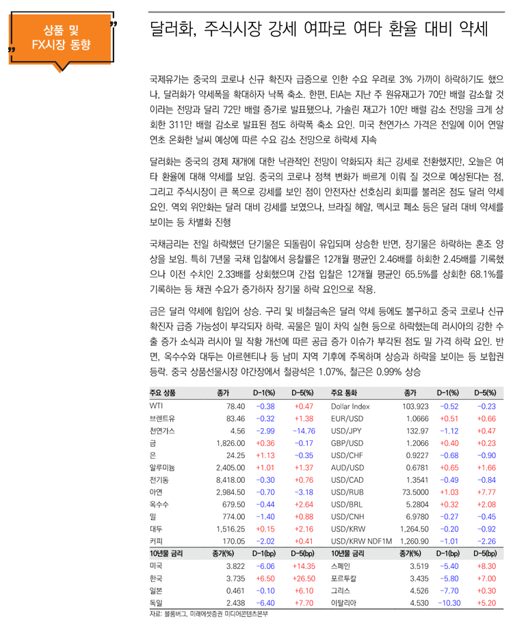 이런 가운데 미 증시가 올해 낙폭이 컸던 대형 기술주 및 반도체, 전기차 업종 중심으로 반발 매수세가 유입되며 강세를 보인 점은 주목할 필요가 있음. 오늘 한국 증시는 비록 휴장이었지만, 내년 초 한국 증시에 긍정적인 영향을 줄 것으로 예상되기 때문. 더 나아가 인플레이션 하방 압력이 뚜렷한 가운데 달러 약세 등도 연초 한국 증시 강세를 견인할 것으로 전망