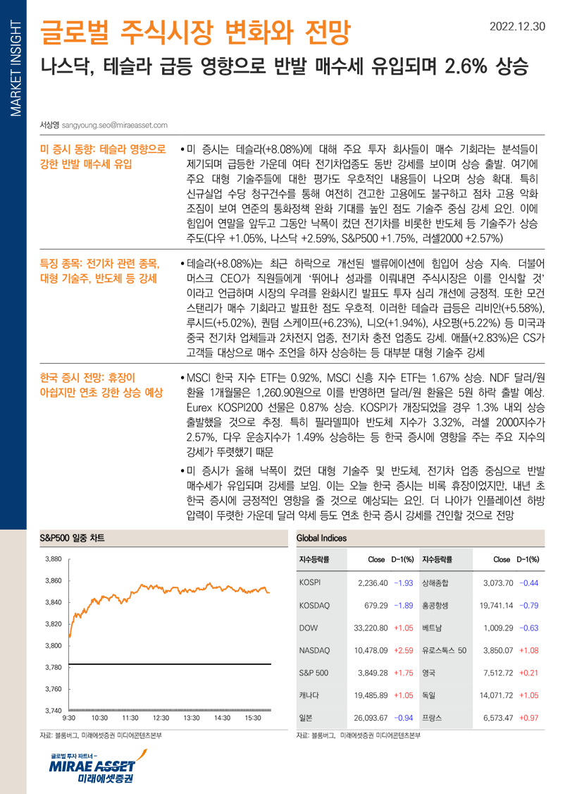 금일 뉴욕증시는 기술주 반등에 상승 출발하여 상승 마감. 연말 분위기가 이어지는 가운데 빅테크 종목들의 주가가 반등하며 주가에 힘을 실었음. 개장 후 테슬라의 주가는 전일대비 7% 이상 오르며 120달러대를 회복함. 일론 머스크 테슬라 최고경영자(CEO)는 직원들에게 주식 시장의 광기에 휘둘리지 말라는 내용을 담은 서한을 발송한 것으로 알려졌다는 소식이 있엇음. 전일 1년 반 만에 최저치로 내렸던 뉴욕증시 최고 대장주 애플의 주가도 전장대비 2% 이상 상승세 시현. 뉴욕증시는 올해 단 2거래일만을 남겨두고 있는 상황 속에서, 주요 거래가 거의 끝난 가운데 막판 반등 시도가 나오는 모습이라는 해석이 있었음. 제이피모간체이스의 한 이코노미스트는 '23년 예상되는 매크로 악재가 현재 증시에 어느 정도 반영된 상태라고 언급함.미국 증시는 '22년 다수의 매크로 악재 속에 약세장을 경험하고 있으며, '23년에는 글로벌 경기침체 위험 등 추가적인 매크로 악재가 등장할 전망임을 발언한 반면, '23년 매크로 악재는 익히 예상되고 있고, '22년 미국 증시 약세장이 상당히 반영하고 있는 것으로 추정되는 분석을 제기함. 아직 미국 증시가 저점에 도달한 것은 아니지만, 증시가 신저점으로 하락한 이후에는 추가적인 매크로 악재가 현실화되더라도 충격이 예상보다는 약할 것임을 덧붙임. 이에 미국 증시의 '23년 리스크 대비 보상 비율이 상당히 매력적인 수준까지 개선되었다고 본다며 '23년에 걸쳐 미국 증시가 상승할 것이라는 전망을 제시함.