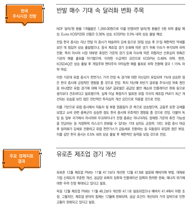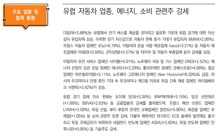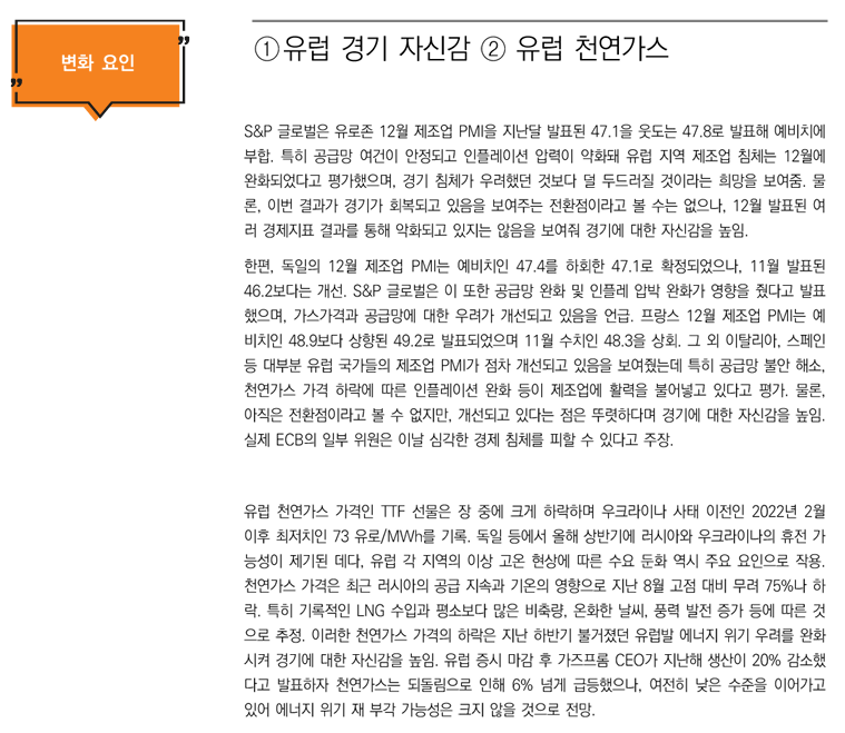 유럽 증시가 천연가스 가격 안정 속 경기에 대한 자신감이 유입되며 1%대 상승한 점은 한국 증시에 긍정적인 영향을 줄 것으로 전망. 특히 지난해 하반기 글로벌 주식시장 위축 원인 중 하나였던 유럽 경기에 대해 이날 S&P 글로벌은 공급망 불안 해소와 인플레이션 완화 등으로 생각보다 견조하다고 발표했으며, 실제 이날 확정치가 발표된 유럽 각국의 제조업 PMI가 최근 개선되는 모습을 보인 점은 전반적인 투자심리 개선 요인으로 작용할 것으로 전망.