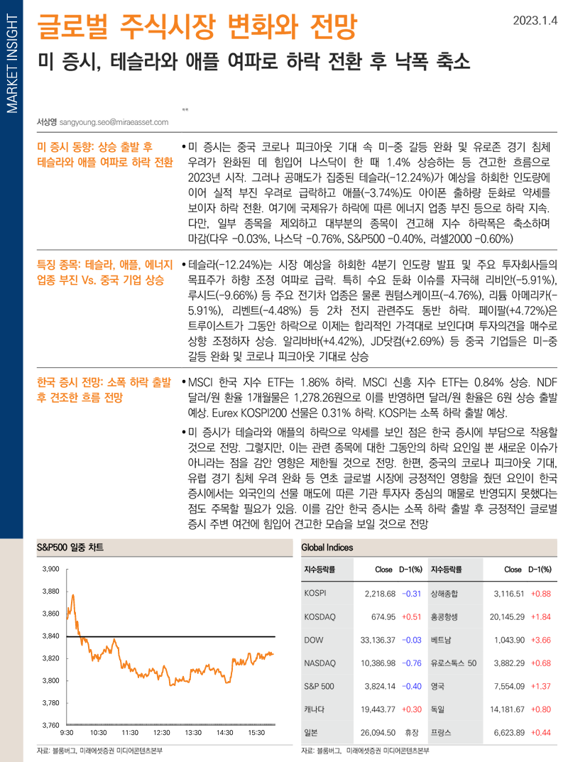 미 증시는 중국 코로나 피크아웃 기대 속 미-중 갈등 완화 및 유로존 경기 침체 우려가 완화된 데 힘입어 나스닥이 한 때 1.4% 상승하는 등 견고한 흐름으로 2023년 시작. 그러나 공매도가 집중된 테슬라(-12.24%)가 예상을 하회한 인도량에 이어 실적 부진 우려로 급락하고 애플(-3.74%)도 아이폰 출하량 둔화로 약세를 보이자 하락 전환. 여기에 국제유가 하락에 따른 에너지 업종 부진 등으로 하락 지속. 다만, 일부 종목을 제외하고 대부분의 종목이 견고해 지수 하락폭은 축소하며 마감(다우 -0.03%, 나스닥 -0.76%, S&P500 -0.40%, 러셀2000 -0.60%)