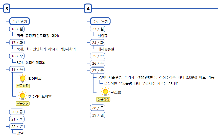 증시캘린더는 개인적으로 관련된 소식을 확인후 작성한 일정이라 변동 또는 오류의 소지가 있습니다.