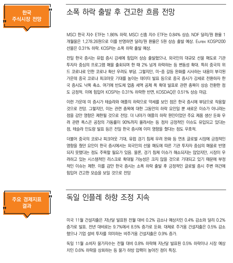 MSCI 한국 지수 ETF는 1.86% 하락. MSCI 신흥 지수 ETF는 0.84% 상승. NDF 달러/원 환율 1개월물은 1,278.26원으로 이를 반영하면 달러/원 환율은 5원 상승 출발 예상. Eurex KOSPI200 선물은 0.31% 하락. KOSPI는 소폭 하락 출발 예상.
