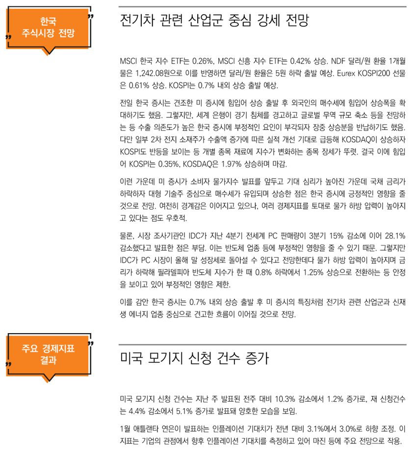 미 증시가 소비자 물가지수 발표를 앞두고 기대 심리가 높아진 가운데 국채 금리가 하락하자 대형 기술주 중심으로 매수세가 유입되며 상승한 점은 한국 증시에 긍정적인 영향을 줄 것으로 전망. 여전히 경계감은 이어지고 있으나, 여러 경제지표를 토대로 물가 하방 압력이 높아지고 있다는 점도 우호적.