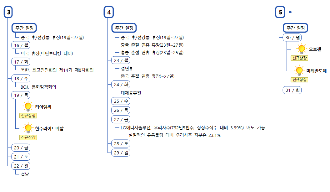 증시캘린더는 개인적으로 관련된 소식을 확인후 작성한 일정이라 변동 또는 오류의 소지가 있습니다.