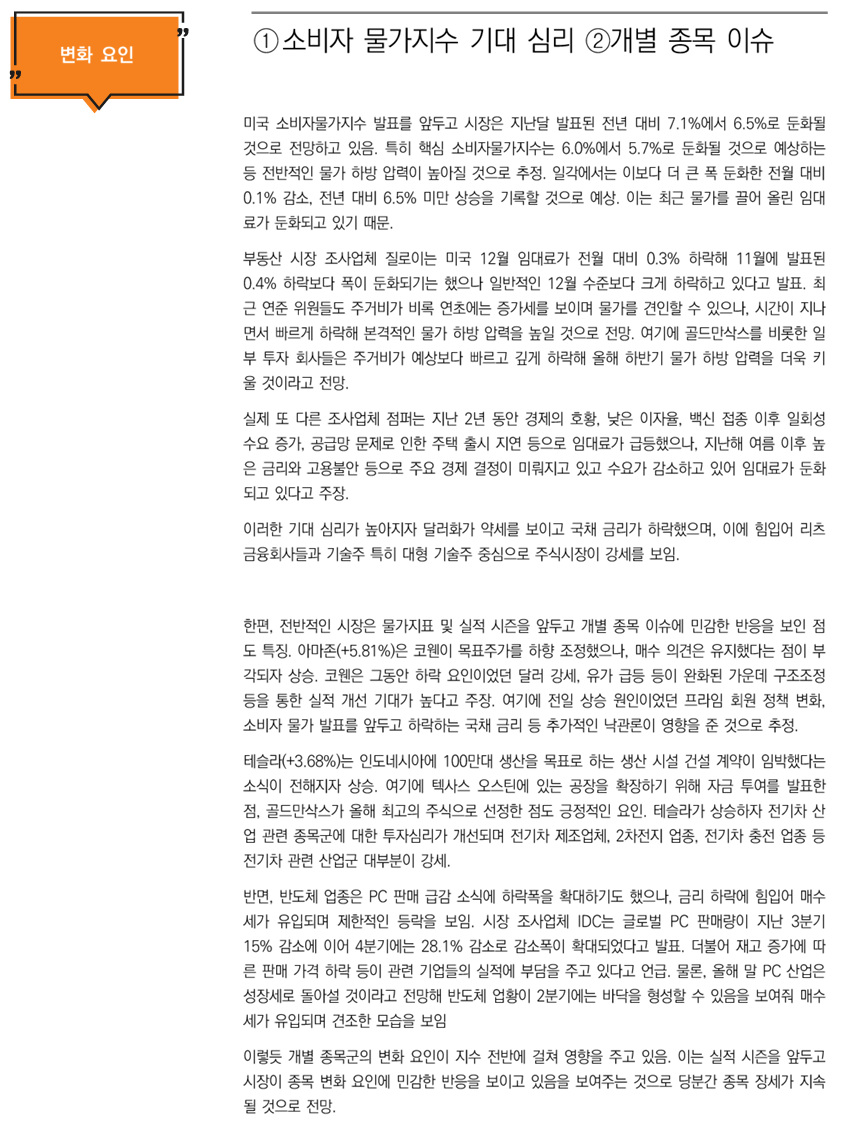 금일 뉴욕 증시는 목요일의CPI데이터 발표를 앞둔 상황에서 종일 강세를 유지하며 상승 마감. 월스트리트저널의조사에 의하면 12월 CPI는 6.5%(YOY)상승해 전월의 7.1%보다 떨어진 수치를 보일 것이라고예상됨. 2022년 6월 CPI가40년만의 최고치인 9.1% 상승을 기록한 것을 감안한다면현재의 예상치대로 발표된다면 시장에 상당히 긍정적인 것으로 보임. 시장의 기대는 인플레이션 완화 및연준의 금리 인상 속도 완화에 있으나 연준 당국자들의 스탠스는 여전히 매파적인 것으로 보임. 한편 당일미국 연방항공청의 시스템 오류로 인한 전국적인 운항 중단 사태는 점진적으로 해결되고 있다고 함.