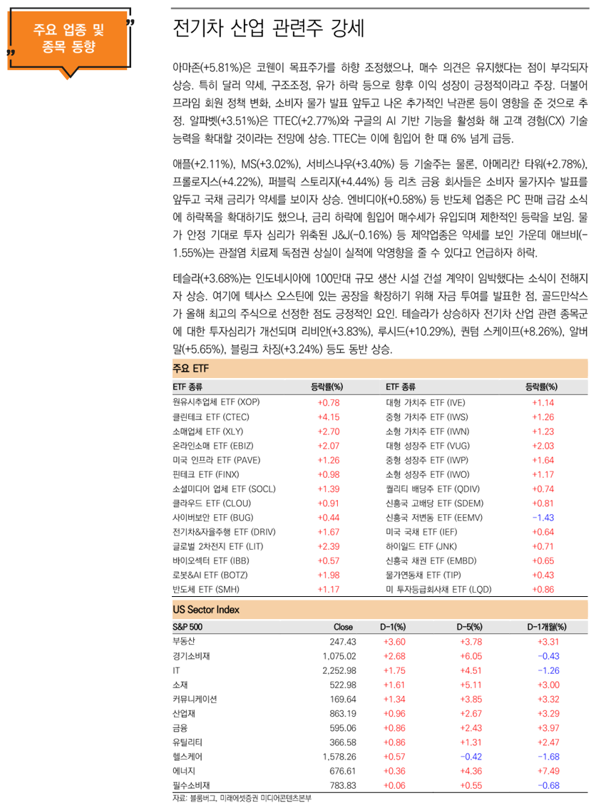 섹터별 ETF는 자유소비재(XLY/+2.67%)섹터와 부동산(VNQ/+3.57%)섹터가 상승 마감.