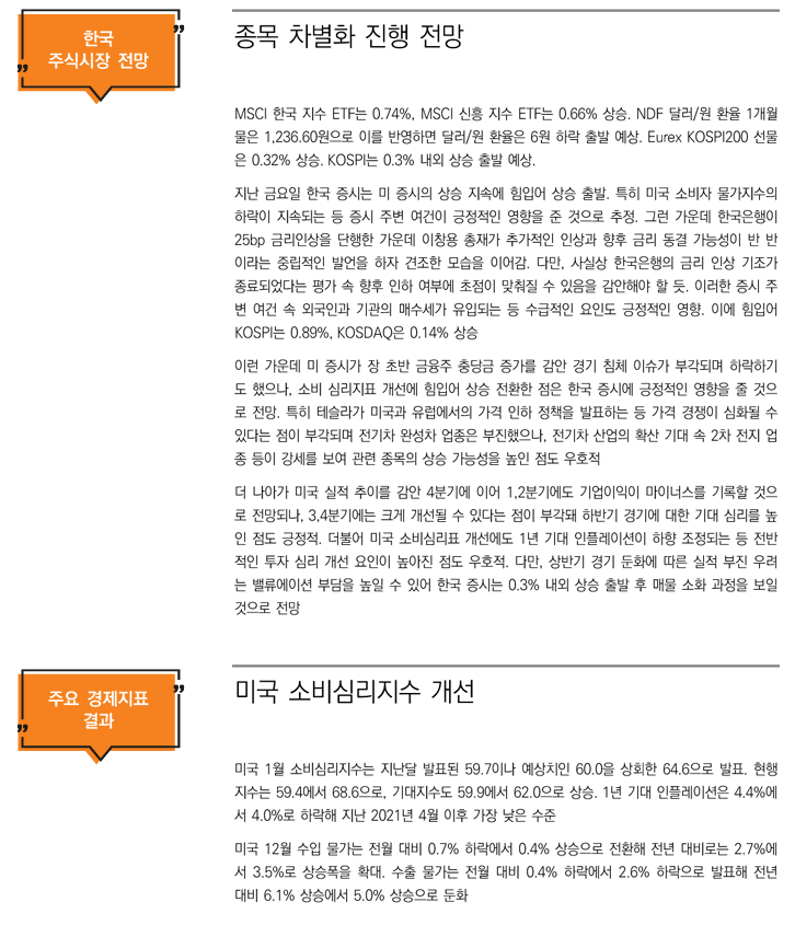 더 나아가 미국 실적 추이를 감안 4분기에 이어 1,2분기에도 기업이익이 마이너스를 기록할 것으로 전망되나, 3,4분기에는 크게 개선될 수 있다는 점이 부각돼 하반기 경기에 대한 기대 심리를 높인 점도 긍정적. 더불어 미국 소비심리표 개선에도 1년 기대 인플레이션이 하향 조정되는 등 전반적인 투자 심리 개선 요인이 높아진 점도 우호적. 다만, 상반기 경기 둔화에 따른 실적 부진 우려는 밸류에이션 부담을 높일 수 있어 한국 증시는 0.3% 내외 상승 출발 후 매물 소화 과정을 보일 것으로 전망