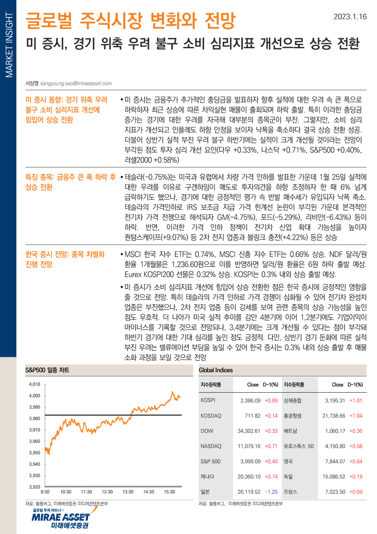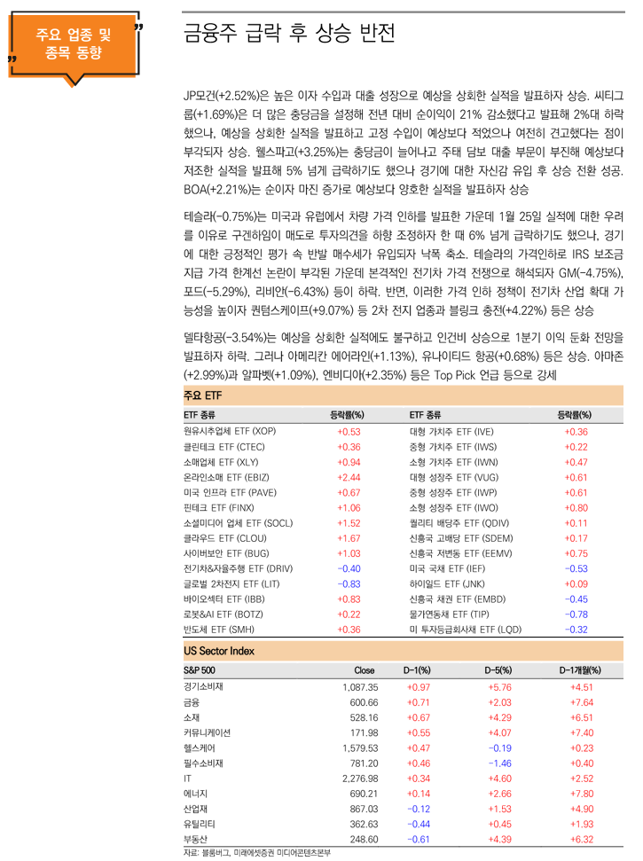 미 증시가 장 초반 금융주 충당금 증가를 감안 경기 침체 이슈가 부각되며 하락하기도 했으나, 소비 심리지표 개선에 힘입어 상승 전환한 점은 한국 증시에 긍정적인 영향을 줄 것으로 전망. 특히 테슬라가 미국과 유럽에서의 가격 인하 정책을 발표하는 등 가격 경쟁이 심화될 수 있다는 점이 부각되며 전기차 완성차 업종은 부진했으나, 전기차 산업의 확산 기대 속 2차 전지 업종 등이 강세를 보여 관련 종목의 상승 가능성을 높인 점도 우호적