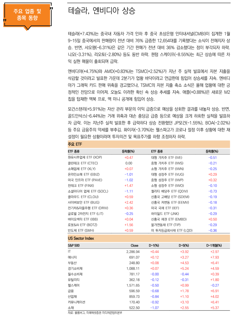 섹터별 ETF는 IT(XLK/ 0.46%)섹터가 강세를 보였으며 금융(XLF/-0.72%)섹터는 부진한 모습을 보임.