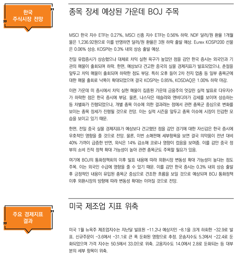 여기에 BOJ의 통화정책회의 이후 발표 내용에 따라 외환시장 변동성 확대 가능성이 높다는 점도 주목. 이는 외국인 수급에 영향을 줄 수 있기 때문. 이를 감안 한국 증시는 0.3% 내외 상승 출발 후 긍정적인 내용이 유입된 종목군 중심으로 견조한 흐름을 보일 것으로 예상되나 BOJ 통화정책 이후 외환시장의 방향에 따라 변동성 확대는 이어질 것으로 전망.