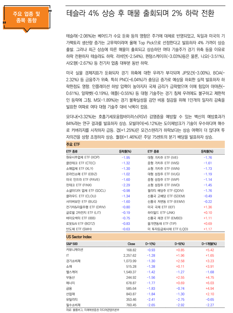 미 증시가 최근 상승에 따른 매물 출회되며 하락한 점은 한국 증시에 부담으로 작용할 것으로 전망. 특히 물가 하향 안정 가능성은 더욱 높아졌으나, 대부분의 품목에 대해 소매판매와 산업생산이 위축되고 있어 경기에 대한 우려가 높아진 점은 수출 의존도가 높은 한국 증시에 부담. 더불어 연준이 베이지북을 통해 최근 경기는 안정적이나 앞으로 몇 개월동안 거의 성장하지 않을 것이라고 언급하는 등 경기에 대한 우려를 표명한 점도 부담.