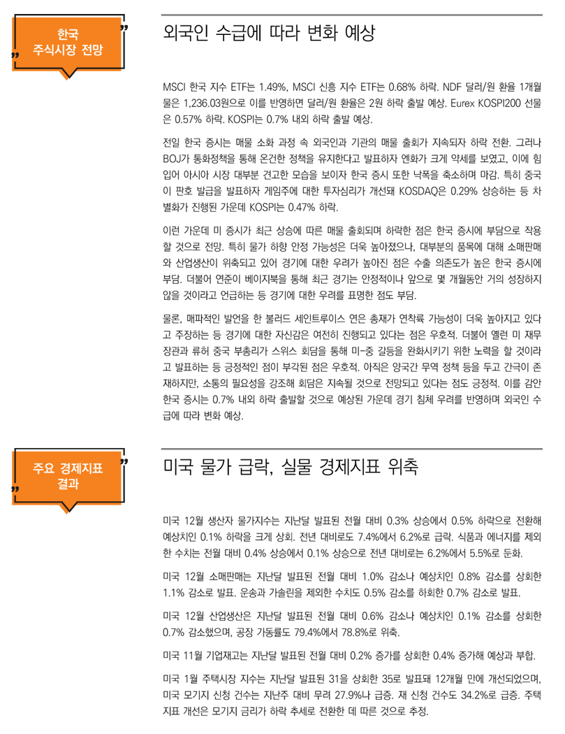 MSCI 한국 지수 ETF는 1.49%, MSCI 신흥 지수 ETF는 0.68% 하락. NDF 달러/원 환율 1개월물은 1,236.03원으로 이를 반영하면 달러/원 환율은 2원 하락 출발 예상. Eurex KOSPI200 선물은 0.57% 하락. KOSPI는 0.7% 내외 하락 출발 예상