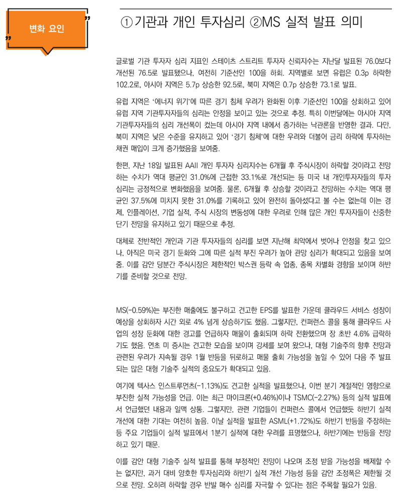 미 증시가 장 초반 MS의 실적 발표 후 대형 기술주 중심으로 크게 하락하기도 했으나, 장중 하반기 실적에 대한 기대 심리가 유입되며 낙폭을 축소한 점은 한국 증시에 긍정적인 영향을 줄 것으로 전망. 특히 일부 실적 부진을 발표한 기업들이 약세를 보이기는 했으나, 업종 전반으로 확대되지 않는 등 심리적인 안정을 보인 점, 기관 투자자 특히 아시아 지역 기관 투자자 중심으로 낙관론이 유입되는 등 긍정적인 내용이 발표된 점도 우호적.