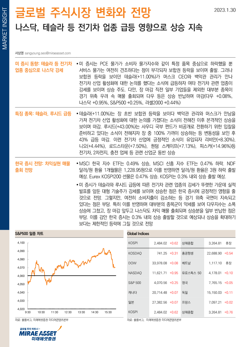 미 증시가 테슬라와 루시드 급등에 따른 전기차 관련 업종의 강세가 뚜렷한 가운데 실적 발표를 앞둔 대형 기술주가 강세를 보이며 상승한 점은 한국 증시에 긍정적인 영향을 줄 것으로 전망. 특히 머스크와 백악관 고위 관리가 전기차 산업 활성화에 대한 논의를 했다는 소식은 관련 종목군에 대한 긍정적인 영향을 줄 수 있다는 점도 우호적.