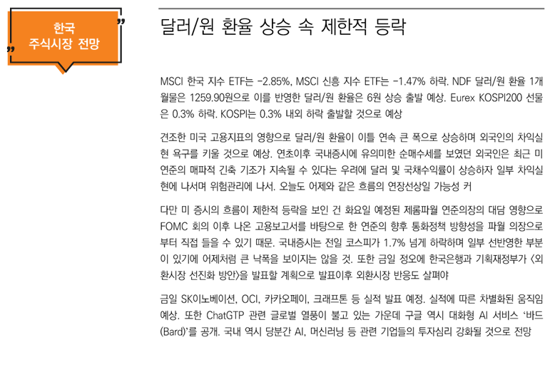 - NDF 환율(1개월물): 1,259.90원 / 전일 대비 6원 상승 출발 예상