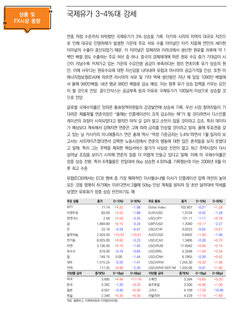 섹터별 ETF는 에너지(XLE/+3.20%)섹터와 IT(XLK/+2.49%)섹터가 상승하며마감. Barron's는 터키의 석유 수출 터미널이 지진으로 인해 마비되면서, 원유 수급 불균형이 심화되고 있다고 보도함. 터키 가지안테프 지역에서 M 7.8 규모의 지진이 발생하면서 도시가 파괴되고 수천 명의 사망자가 발생하고 있는 가운데, 이것이 글로벌 원유 공급부족 문제를 심화시킬 것이라는 우려가 유가를 추가로 상승시키고 있다고 전달함. 터키 제이한 지역에 위치한 석유 수출 터미널은 아제르바이잔과 이라크에서 산출된 원유를 수출하는 중요한 통로로, 일일 100만 배럴을 수출하고 있으나, 이번 지진 사태로 인해 운영이 중단된 상태임을 언급. 여기에 중국의경제활동 재개가 이루어지면서 원유 수요가 증가하고 있는 것도 원유 수급 불균형을 심화시키게 된다고 발언. 한편 Saxo Bank의 애널리스트는 사우디 아라비아 Aramco는 아시아로수출하는 원유에 대한 가격을 인상한다고 발표함. 이는 아시아 지역, 나아가글로벌 전역에서 원유 수요가 강력할 것이라는 자신감을 보여주는 현상임을 언급함.