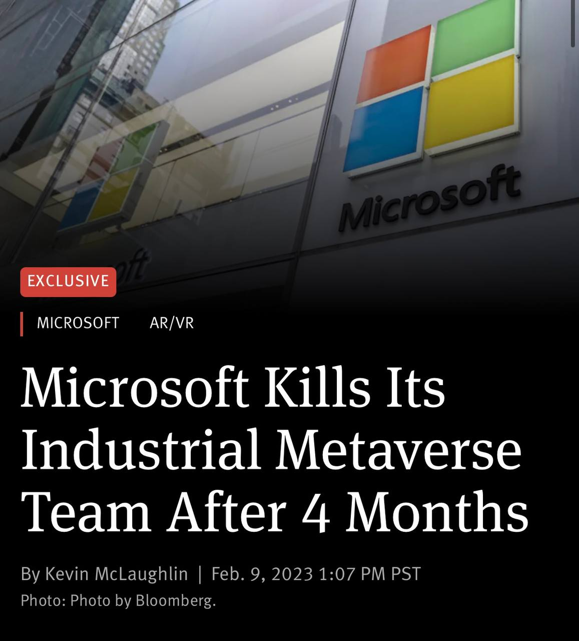•마이크로소프트는 작년10월 발전소, 로보틱스, 물류망 등 다양한 산업용 운영시스템을 설치운영하는데 메타버스를 이용하기 위해 인더스트리얼 메타버스 팀을 설립했으나, 4달만에 100여명의 인력 전원을 해고하고 팀은 해체