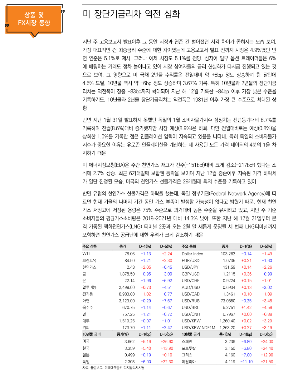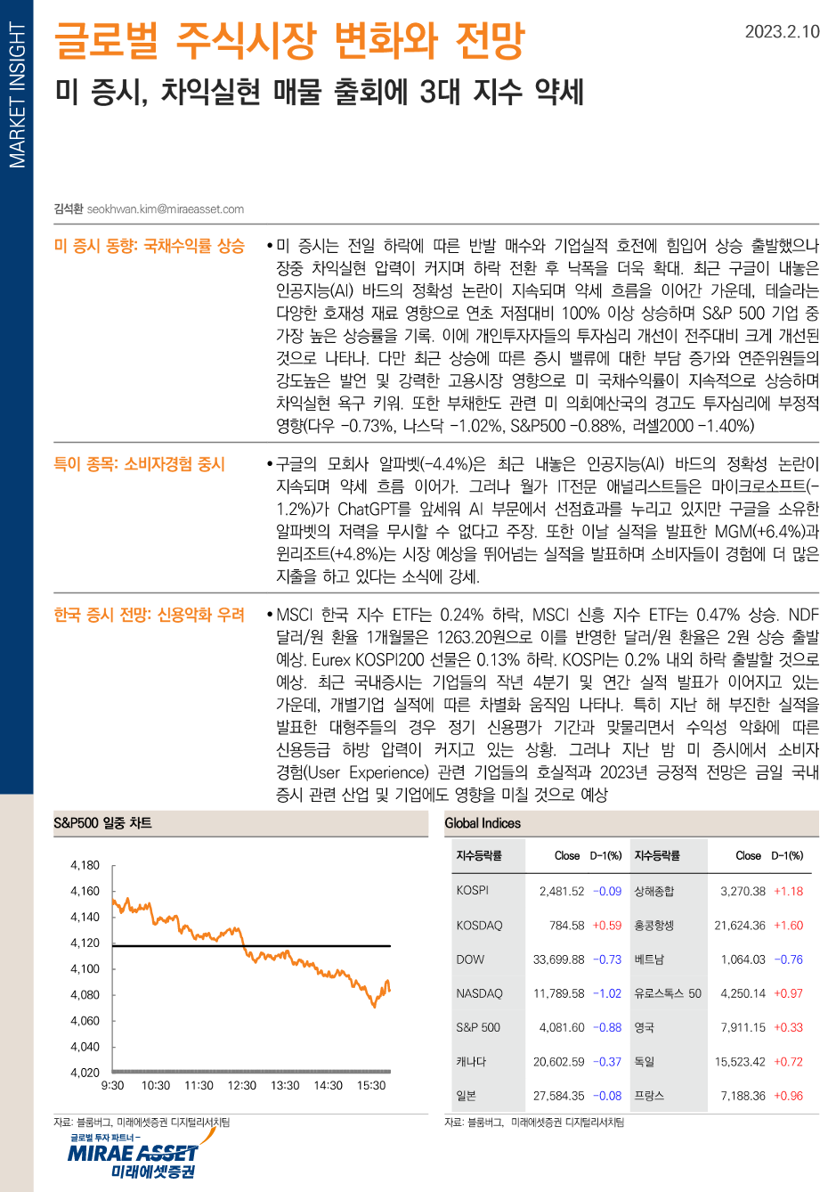 MSCI 한국 지수 ETF는 0.24% 하락, MSCI 신흥 지수 ETF는 0.47% 상승. NDF 달러/원 환율 1개월물은 1263.20원으로 이를 반영한 달러/원 환율은 2원 상승 출발 예상. Eurex KOSPI200 선물은 0.13% 하락. KOSPI는 0.2% 내외 하락 출발할 것으로 예상. 최근 국내증시는 기업들의 작년 4분기 및 연간 실적 발표가 이어지고 있는 가운데, 개별기업 실적에 따른 차별화 움직임 나타나. 특히 지난 해 부진한 실적을 발표한 대형주들의 경우 정기 신용평가 기간과 맞물리면서 수익성 악화에 따른 신용등급 하방 압력이 커지고 있는 상황. 그러나 지난 밤 미 증시에서 소비자 경험(User Experience) 관련 기업들의 호실적과 2023년 긍정적 전망은 금일 국내 증시 관련 산업 및 기업에도 영향을 미칠 것으로 예상