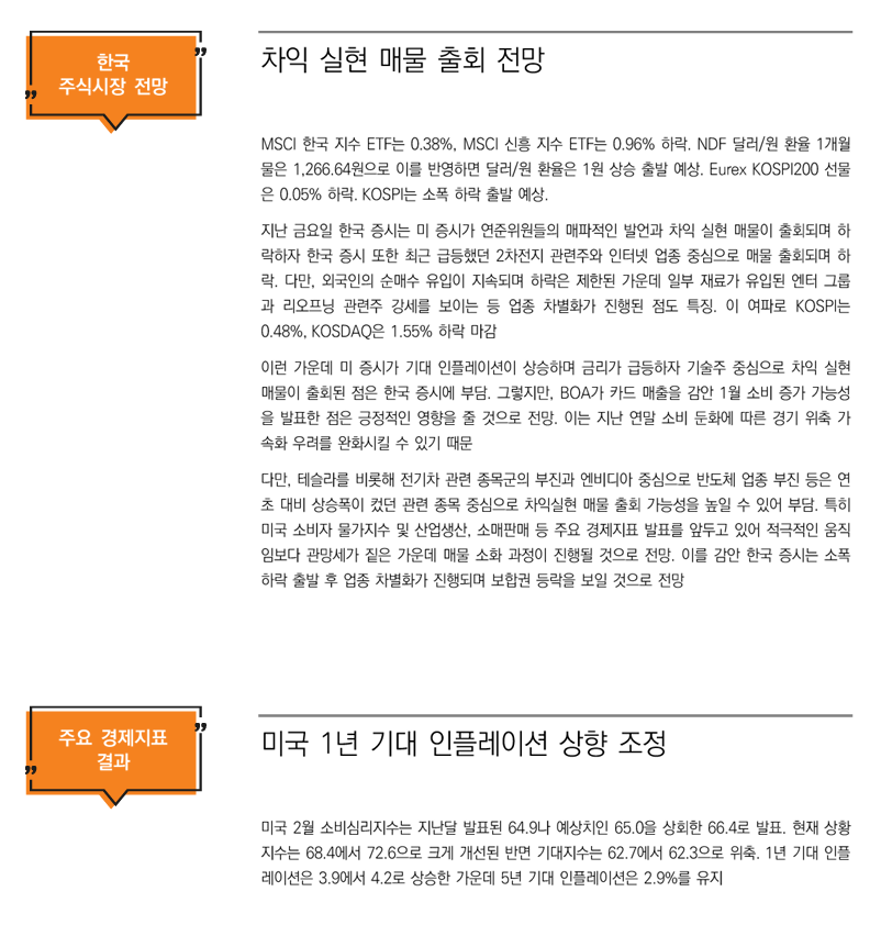 미 증시는 차익실현 욕구가 지속된 가운데 하락 출발했으나, 소비 심리지수가 견고한 모습을 보이자 다우지수가 상승하는 등 반발 매수 심리 또한 이어짐. 특히 BOA가 카드 매출을 통해 1월 소비가 개선되었다고 발표하는 등 긍정적인 소식도 영향. 다만, 1년 기대 인플레이션이 상승하자 금리가 급등했으며, 이 여파로 그동안 상승을 견인해 왔던 기술주 중심으로 차익 매물이 출회되며 나스닥은 하락하는 등 차별화가 진행되며 혼조 마감(다우 +0.50%, 나스닥 -0.61%, S&P500 +0.22%, 러셀2000 +0.18%)