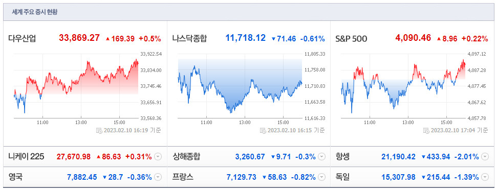 10일(현지시간) 뉴욕증권거래소(NYSE)에서 다우존스30산업평균지수는 전장보다 169.39포인트(0.50%) 오른 33,869.27에, 스탠더... 한국경제 | 2023-02-11 07:33