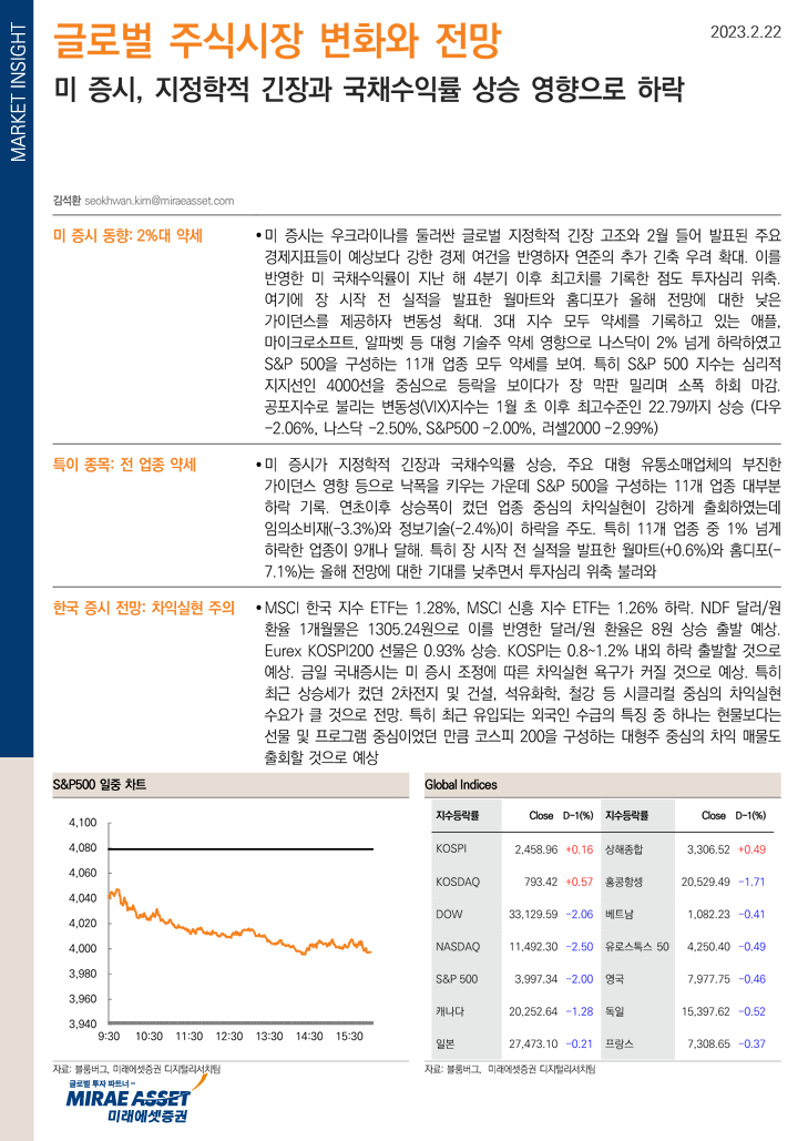 (1) 미 10년 국채금리가 4%에 근접하면서 미 증시가 2% 이상 내렸습니다.
