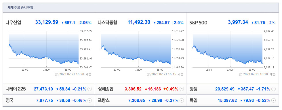 21일(현지 시간) 미국 뉴욕증시의 주요 지수는 기준금리가 더 높아질 것이라는 우려에 국채금리가 치솟고 월마트와 홈디포의 소비 둔화 전망이 제기... 서울경제 | 2023-02-22 06:41
