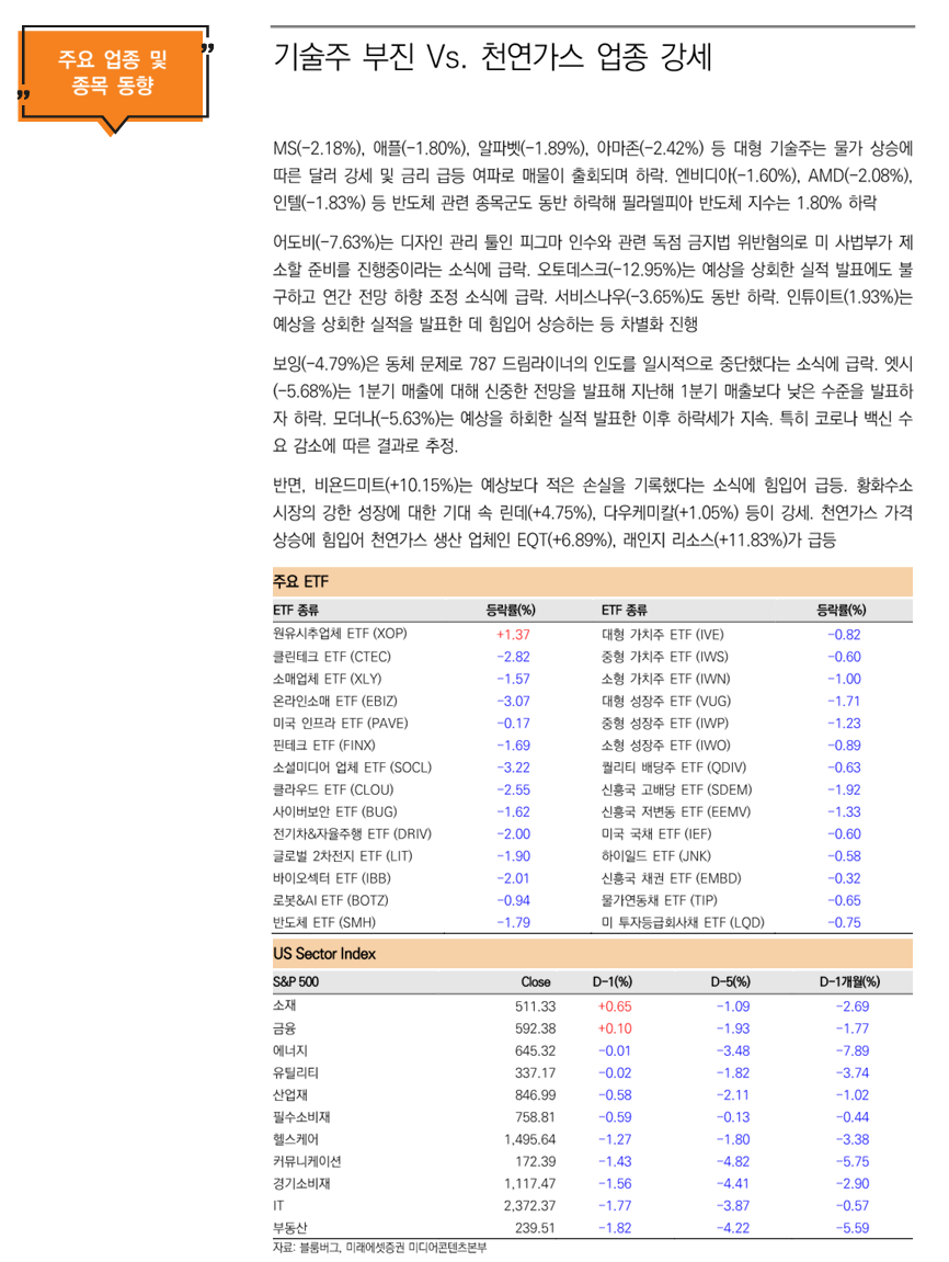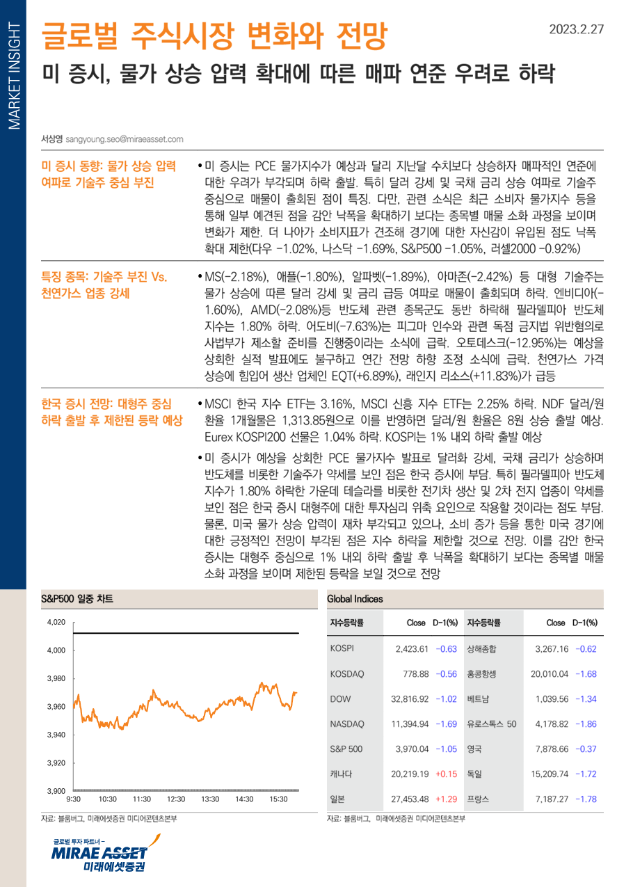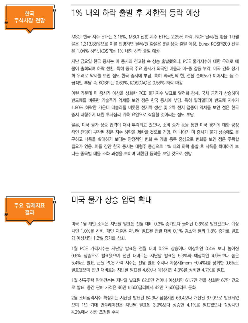 미 증시가 예상을 상회한 PCE 물가지수 발표로 달러화 강세, 국채 금리가 상승하며 반도체를 비롯한 기술주가 약세를 보인 점은 한국 증시에 부담. 특히 필라델피아 반도체 지수가 1.80% 하락한 가운데 테슬라를 비롯한 전기차 생산 및 2차 전지 업종이 약세를 보인 점은 한국 증시 대형주에 대한 투자심리 위축 요인으로 작용할 것이라는 점도 부담.