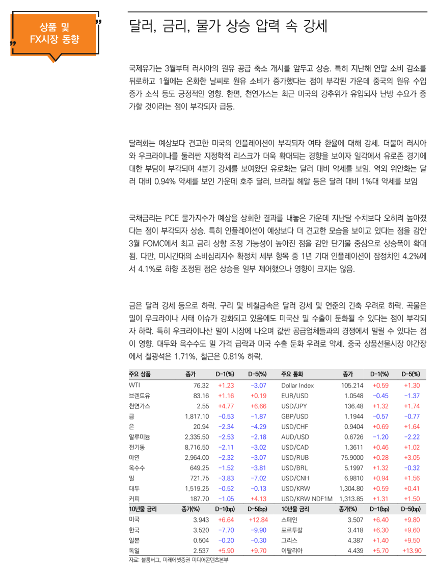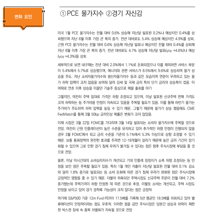금일 미국 증시는 지난날의 상승폭을 반납하며 하락 마감. 금일 공개된 미국의 1월 개인소비지출(PCE)가 0.6%로 시장의 전망치인 0.4%를 상회하며 급락세 시현. 이에 따라 연준의 추가 긴축 가능성이 제기되며 위험자산 회피 심리가 확대되고 국채 금리와 달러가 강세를 시현. 금일 CME 패드워치는 오는 3월 FOMC통화정책 회의에서 50bp의 금리를 인상에 지난주 18%에서30%의 확률로 큰 폭의 상승폭을 나타냄. 한편, 미국의 1월 개인소득은 예상치인 1.0%를 하회하는 0.6%로 집계. 이에 전문가들은 미국의 가계 저축이 점차 바닥을 나타낼 것이라는 전망을 제기. 미국의 추가 금리인상과 목표 금리 상향에 대한 우려가 나타나며, 경제의 연착륙에 우려 또한 확대.