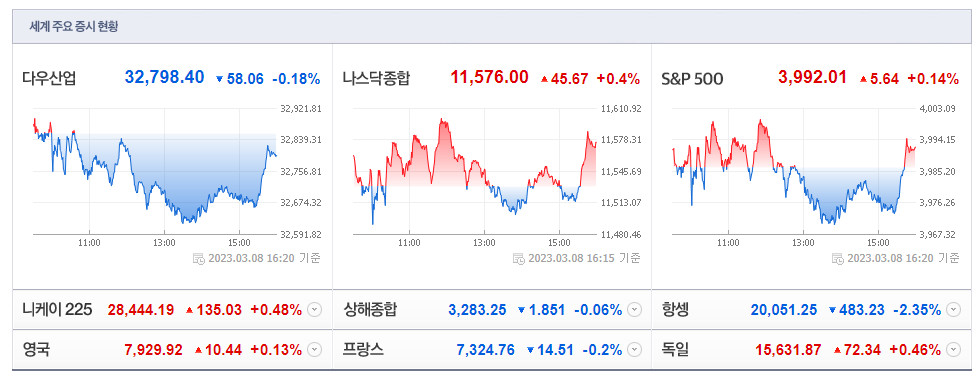 뉴욕증시는 8일(현지시간) 혼조 마감했다. 뉴욕증권거래소(NYSE)에서 다우지수는 전 거래일 대비 58.06포인트(0.18%) 하락한 3만279... 한국경제TV | 2023-03-09 07:08