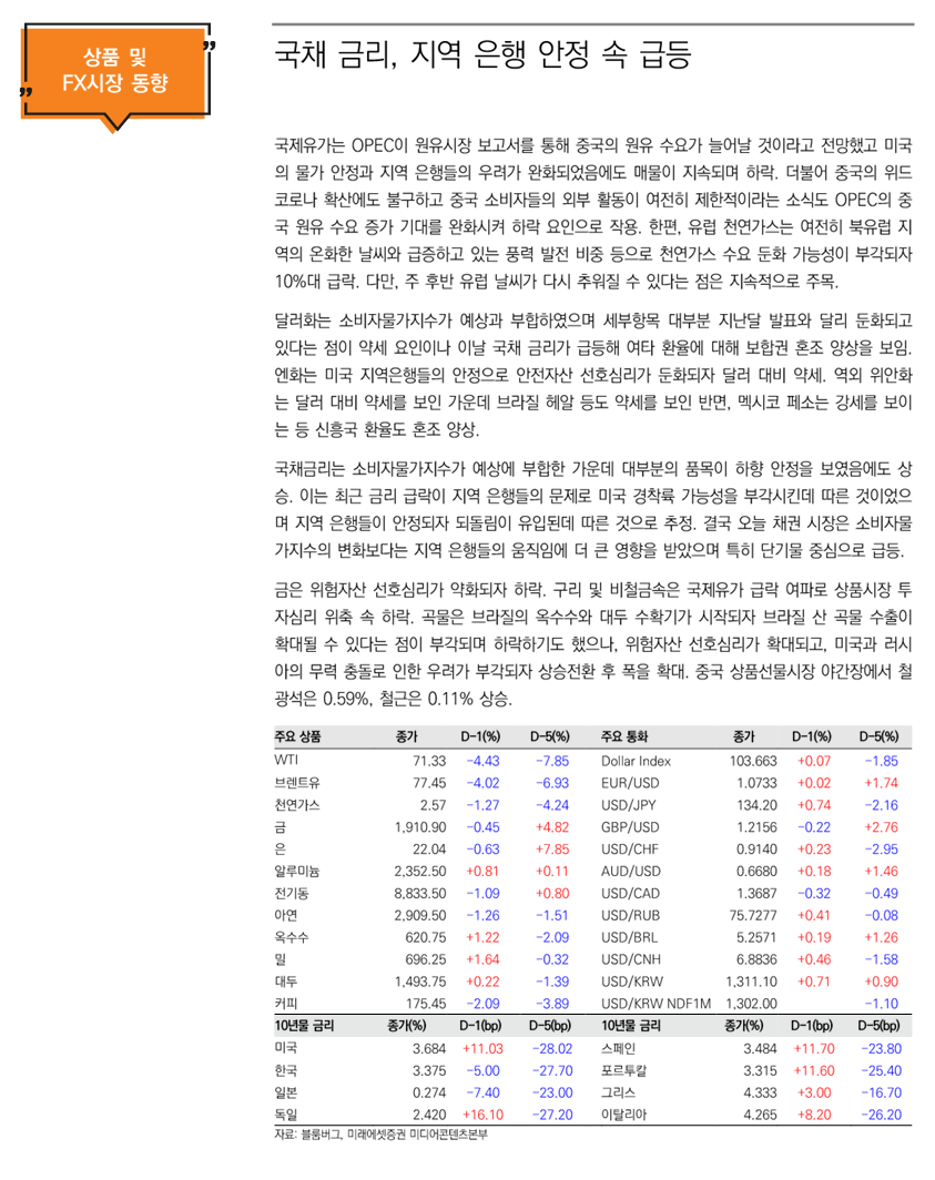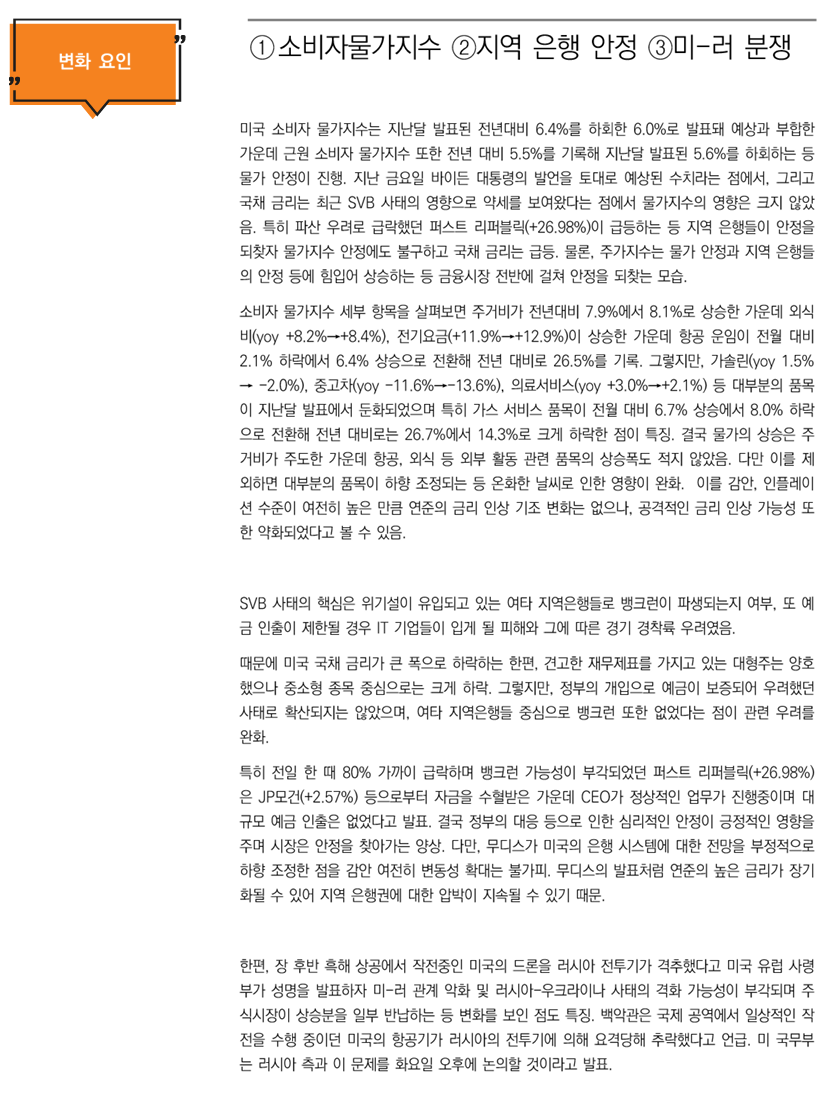 미 증시가 물가 하락 압력이 지속된 가운데 지역 은행들에 대한 우려가 완화되며 강세를 보인 점은 전일 한국 증시 하락을 뒤로하고 강세 요인으로 작용할 것으로 전망. 더불어 중소형 지수인 러셀 2000지수가 1.87%, 필라델피아 반도체 지수가 3.03% 상승하는 등 한국 증시에 영향을 주는 주요 지수 강세폭이 상대적으로 컸다는 점도 투자 심리에 우호적인 영향을 줄 것으로 전망.