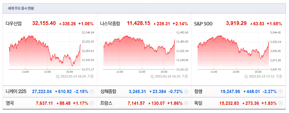 뉴욕증시는 14일(현지시간) 상승했다. 뉴욕증권거래소(NYSE)에서 다우지수는 전 거래일 대비 336.26포인트(1.06%) 상승한 3만2155... 한국경제TV | 2023-03-15 06:43
