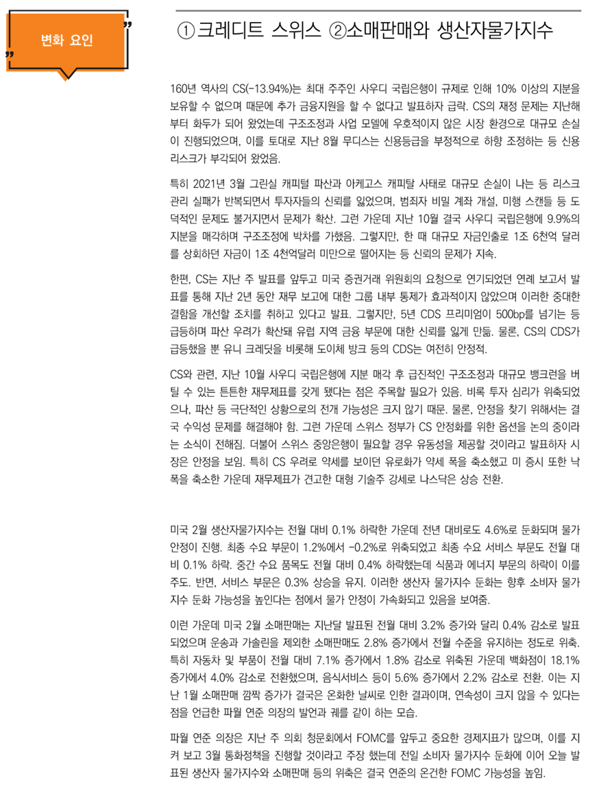 미 증시는 크레디트 스위스(-13.94%)가 파산 우려가 부각되며 급락하자 금융주 중심으로 하락. 더불어 이 영향으로 글로벌 경기에 대한 우려 속 국제유가의 급락세가 이어지자 에너지 업종도 동반 하락. 그러나 장 후반 스위스 정부가 크레디트 스위스 안정을 위한 옵션을 논의하고 있다는 소식에 낙폭을 축소. 특히 유로화 약세로 강세를 보이던 달러화가 그 폭을 축소하자 재무제표가 견고한 대형 기술주의 강세가 뚜렷하게 진행되며 나스닥은 상승 전환하는 등 하락폭을 축소하며 마감(다우 -0.87%, 나스닥 +0.05%, S&P500 -0.70%, 러셀2000 -1.74%)