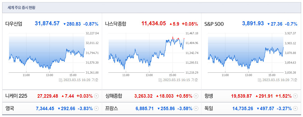 뉴욕증시는 15일(현지시간) 혼조 마감했다. 뉴욕증권거래소(NYSE)에서 다우지수는 전장보다 280.83포인트(0.87%) 하락한 31,874.... 한국경제TV | 2023-03-16 06:45