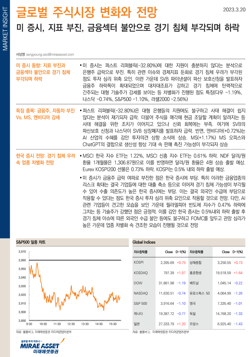 미 증시는 퍼스트 리퍼블릭(-32.80%)에 대한 지원이 충분하지 않다는 분석으로 은행주 급락으로 부진. 특히 관련 이슈와 경제지표 둔화로 경기 침체 우려가 부각된 점도 투자 심리 위축 요인. 이런 가운데 SVB 파이낸셜이 파산 보호신청을 발표하자 금융주 하락폭이 확대되었으며 대차대조표가 강하고 경기 침체에 탄력적으로 간주되는 대형 기술주가 강세를 보이는 등 차별화가 진행된 점도 특징(다우 -1.19%, 나스닥 -0.74%, S&P500 -1.10%, 러셀2000 -2.56%)
