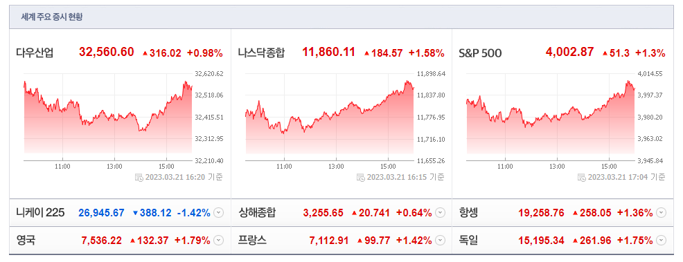 뉴욕증시는 21일(현지시간) 상승했다. 뉴욕증권거래소(NYSE)에서 다우지수는 전 거래일 대비 316.02포인트(0.98%) 상승한 3만2560... 한국경제TV | 2023-03-22 06:53