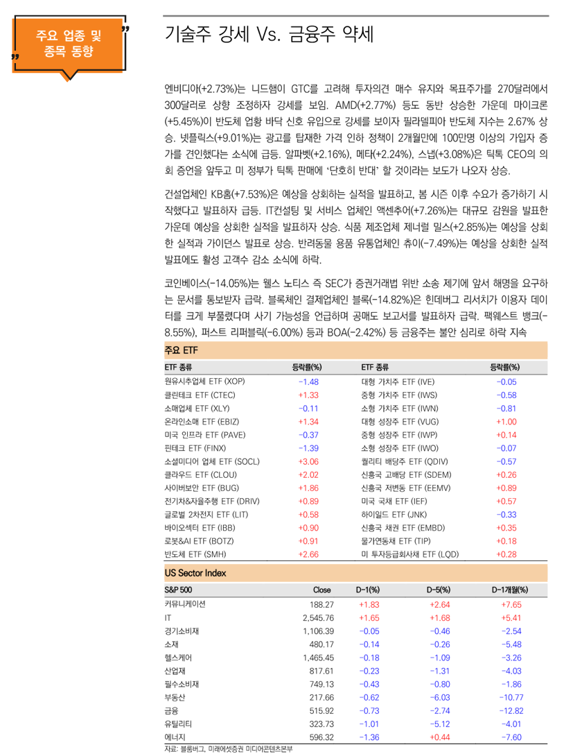 테마별 ETF는 반도체(SOXX/+2.7%)ETF는 상승한 반면 은행(KRE/-2.8%)ETF는 하락 마감. 반도체 제조업체 엔비디아(NVDA/+2.8%)의 Gen-AI, Grace Hopper 아키텍처 제품, Omniverse 등 경쟁력을 지닌 제품 및 그에 따른 시장 점유율 확대가 이루어 질것이라는 전문가들의 분석이 제기되며 반도체 ETF섹터의 상승을 주도. 한편 이번 연준의 은행 유동성 위기 관련 발언으로 인하여 유동성 리스크에 대한 시장 리스크로 대출 시장의 경색이 불가피 할 것이라는 평가가 은행 섹터의 주가 하락 주요 원인으로 작용.