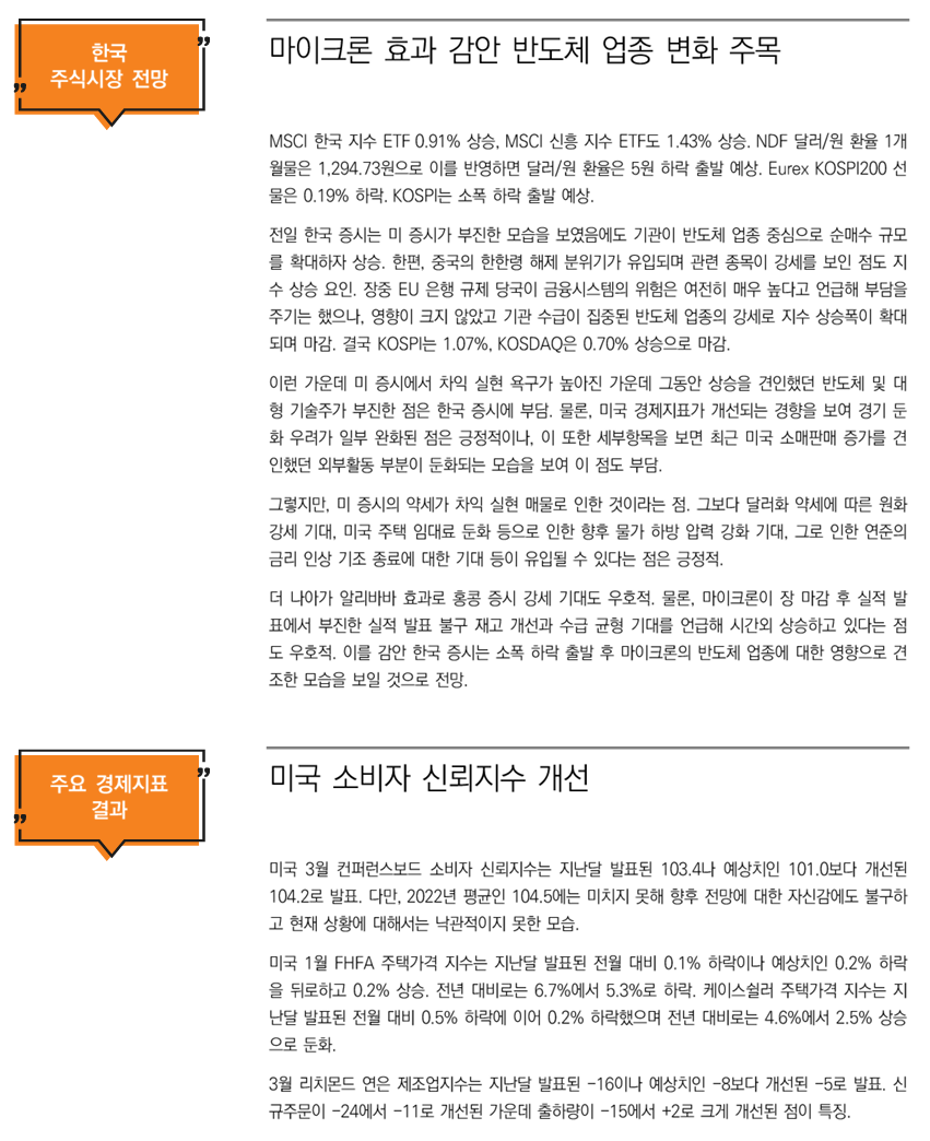 섹터별 ETF는 에너지(XLE/+1.5%)섹터가 상승한 반면 IT(XLK/-0.5%) 섹터는 하락 마감. 현재 은행권의 유동성 위기로 투자심리가 악화되는 상황에서 미국의 견고한 고용지표와 소비지출이 경기 침체 발생 가능성을 낮추고 있다는 분석이 제기되며 에너지 섹터의 상승 압력을 지지. 한편 글로벌 반도체 제조업체 마이크론 테크놀로지(MU)의 이익률 하락 가능성이 제기. 특히 메모리 반도체 수요 악화 및 재고과잉으로 인한 매출 하락이 불가피하다는 분석이 언급되며 IT섹터의 하방을 가중.