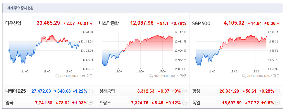 뉴욕증시는 6일(현지시간) 상승했다. 뉴욕증권거래소(NYSE)에서 다우지수는 전 거래일 대비 2.57포인트(0.01%) 오른 3만3485.29에... 한국경제TV | 2023-04-07 06:46