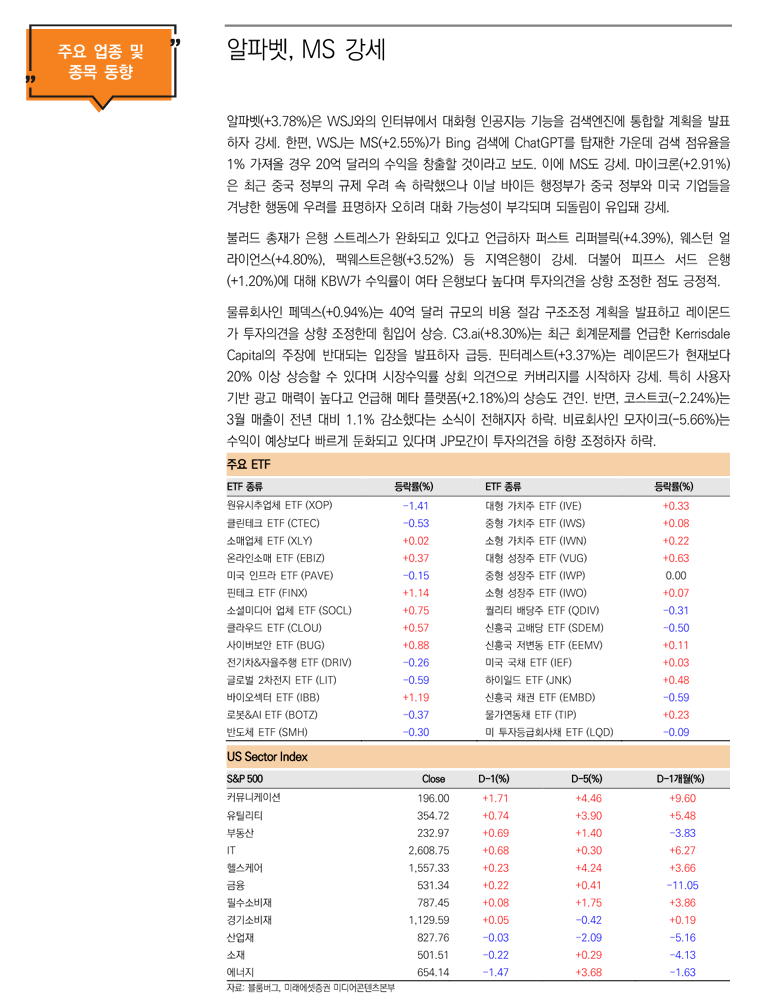 섹터별 ETF는 필수소비재(XLP/+0.08%)섹터와 자유소비재(XLY/+0.01%)섹터가 상승하며 마감. CNBC는 '23년1분기에도 미국 기업들의 배당인상이 이루어졌으나, '23년 전체적인 배당인상폭은 크지 않을 것이라고 보도함. '23년 1분기에 걸쳐 S&P 500 기업들은 1,468억 달러의 배당을 지급했고 이는 전년 동기 대비 7% 증가한 것이며, S&P 500 기업들의 배당수익률은 평균 1.7%로 나타났음을 언급. S&P 500 기업들은 1분기 동안 9,300억 달러의 자사주매입과 5,640억 달러의 배당을 승인했으며, 이는 전년 동기 대비 각각 5.5%, 6.4% 증가한 것을 정리함. '22년에 걸쳐 S&P 500 기업 중 80%에 달하는 399개 기업이 배당을 지급했고, 이 중 83%인 333개 기업이 배당인상을 발표했다며 '23년 1분기에도 이러한 적극적인 주주환원 추세가 이어져서, 132개 기업이 배당인상에 나섰다고 언급함. 다만 이미 S&P 500 기업들이 적극적으로 주주환원을 확대한 가운데, 추가적인 주주환원 성장세는 시장이 기대하는 것만큼 강력하지 못할 것이라는 우려를 하며 S&P 500 기업들은 '21년과 '22년에 배당을 각각11.8% 인상했는데, '23년 1분기 인상은 9.5%에 그쳤다고 밝혔음.