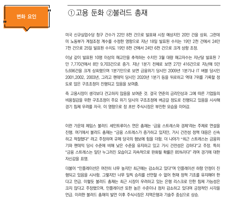 미 증시가 불러드 총재가 금융 스트레스가 완화되고 있고, 미국 경제가 생각보다 강하다며 경기에 대한 자신감을 표명하며 나스닥 중심으로 강세를 보인 점은 한국 증시에 우호적. 물론, 여전히 고용지표 둔화에 따른 경기 침체 우려가 지속되고 있고, 나스닥의 상승도 일부 개별 종목군의 강세에 따른 것일 뿐 대부분의 중소형 종목이 부진한 모습을 보인 점은 부담.