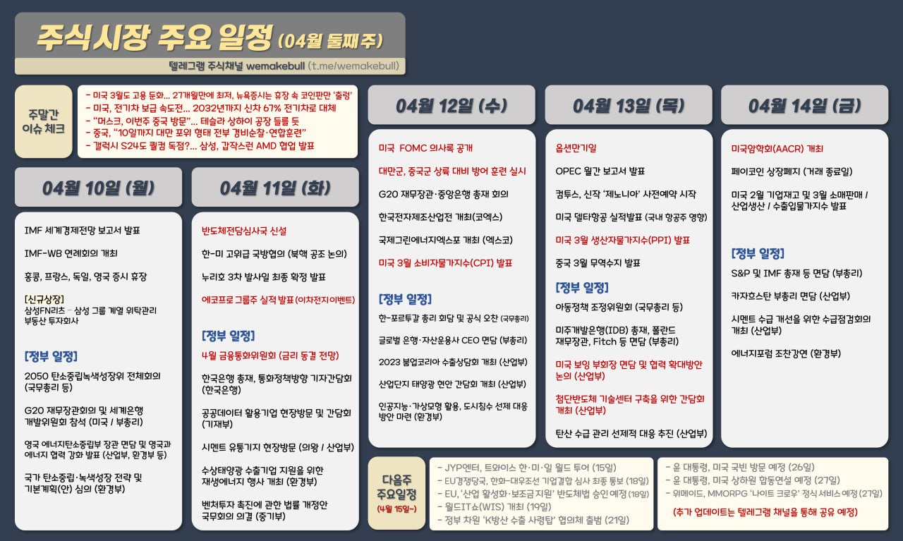 | 4월 11일(화) 증시캘린더 / 해외마감시황 (0) | 2023.04.11 |
