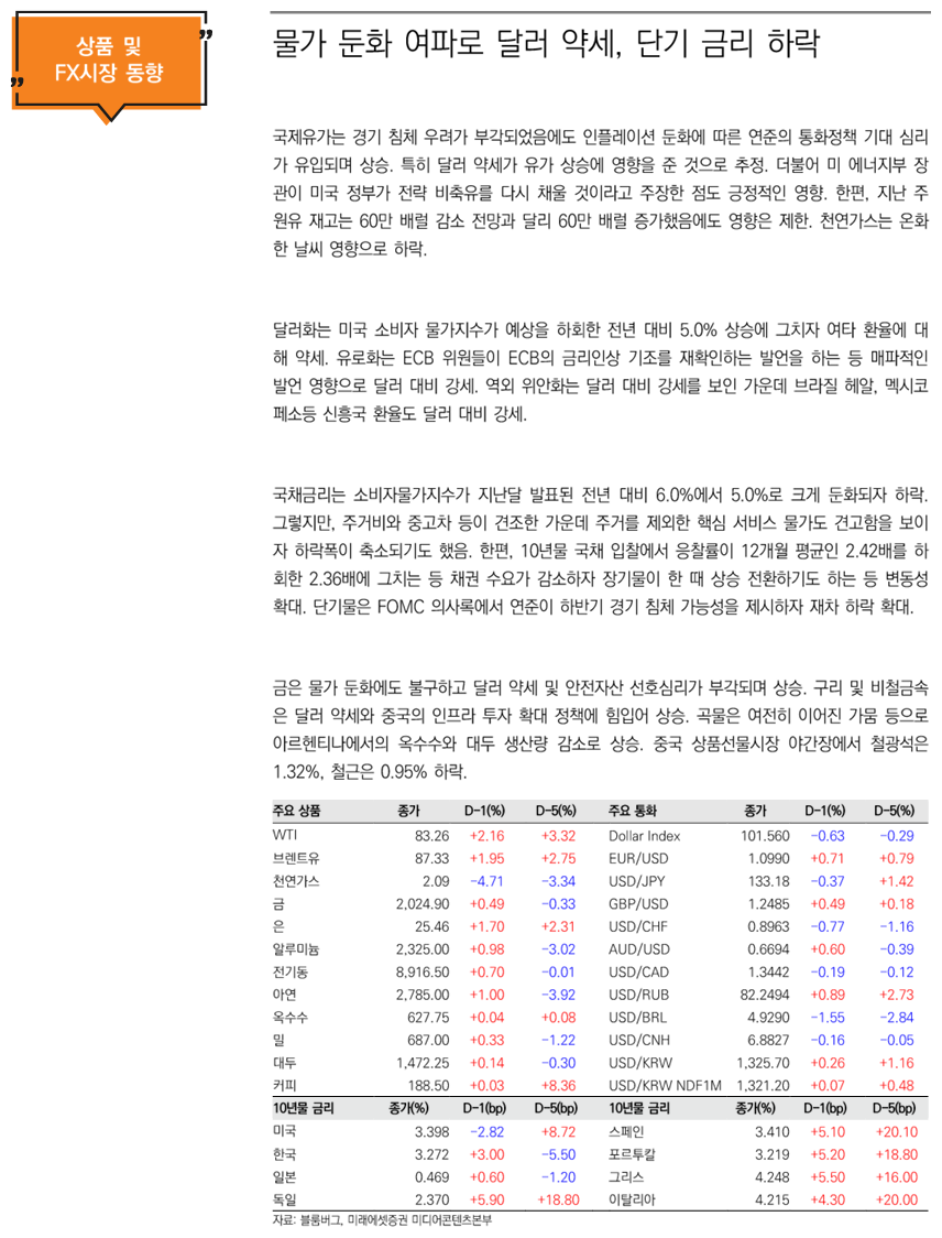 미국 인플레이션 지표가 예상치를 소폭 하회했지만 추가 금리인상에 대한 우려로 뉴욕 증시는 하락 마감. 이와 관련된 외신들의 다양한 의견이 있었음. CFRA는 3월 명목 CPI 인플레이션이 컨센서스를 하회하며 둔화세가 뚜렷해졌고, 이는 미 연준의 통화긴축이 성과를 거두고 있음을 보여줬지만, 근원 CPI는 여전히 강력했고 통화긴축은 더 이루어져야 할 것이라 발언함. 이에 5월 FOMC에서 25bp 금리인상이 단행될 것이라고 예상하지만, 6월 이후의 추가 금리인상은 불필요할 것으로 전망함. Lazard는 강력했던 인플레이션이 차츰 완화되고 있음이 확인된다며 금리인상 압력의 완화는 증시 참가자들의 긍정적 반응으로 나타나고 있다고 전달함. Bolvin Wealth는 인플레이션 등 주요 경제지표는 후행지표이며, 따라서 미국의 경제는 지금 경제지표에서 나타나고 있는 것보다 훨씬 더 위축된 상황일 것이라 예상했으며 강력한 디스인플레이션이 나타날 수 있다고 경고함. CME Group의 FedWatch에서 5월 25bp 금리인상 가능성은 74%로 나타나고 있는 상황. 미국 국채 2년물 금리는 4.00%, 10년물 금리는 3.42%를 기록. WTI 유가는 1.50%, 브렌트유는 1.55% 상승. 달러인덱스는0.55% 하락 중이며, 금 가격은 0.13% 상승 중.