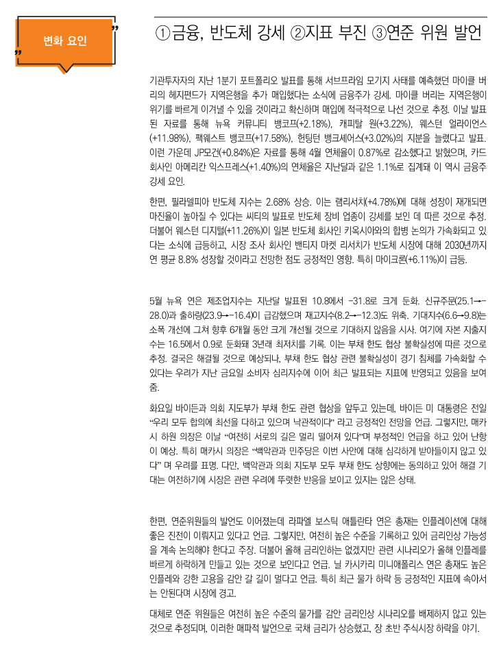 미 증시가 지표 부진과 매파적인 연준 위원들의 발언에도 불구하고 금융주와 반도체 업종 중심으로 강세를 보인 점은 한국 증시에 우호적인 영향을 줄 것으로 전망. 특히 필라델피아 반도체 지수가 2.68% 상승해 관련 종목에 긍정적인 영향을 줄 것으로 전망.