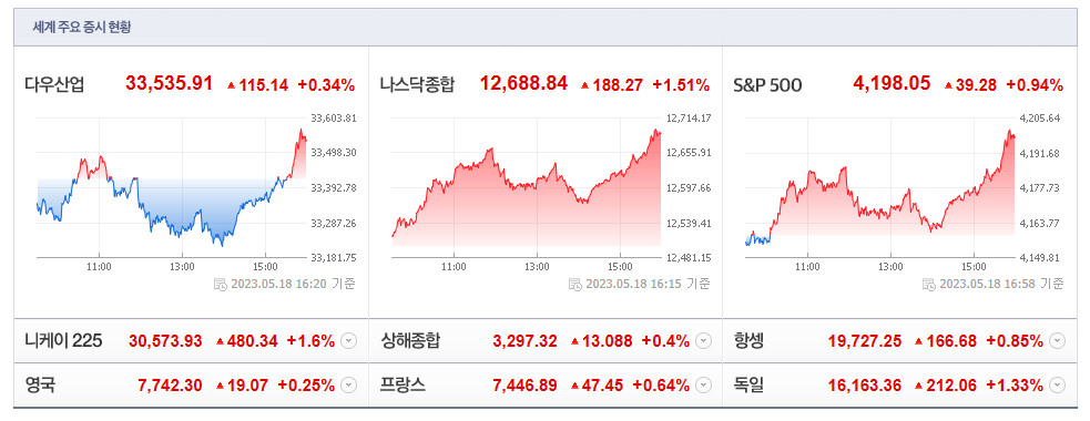 미국 뉴욕 증시가 부채 한도 협상이 이르면 다음주 이뤄질 것이라는 기대감에 일제히 상승했다. 케빈 매카시 미 하원의장은 18일(현지시간) “하원... 이데일리 | 2023-05-19 05:56