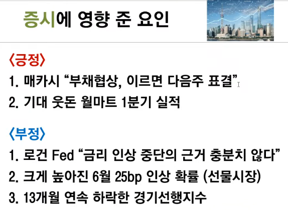 미 증시는 부채 한도 합의 기대에도 경기에 대한 우려 속 다우지수가 장 중 한 때 하락 전환. 그러나 나스닥은 엔비디아(+4.97%)가 신제품 발표 및 젠슨 황 CEO 발언에 힘입어 강세를 보이자 상승하는 차별화가 진행. 특히 젠슨 황의 AI 산업에 대한 발언 등으로 AI 관련된 대형 기술주와 반도체 업종이 상승 주도. 물론, 매파적인 연준 위원들의 발언과 경기 침체 우려로 매물이 출회되기도 했으나 기술주의 강세가 전일에 이어 지수에 긍정적인 영향을 줬고, 장 후반 옵션만기일을 앞두고 수급적인 요인으로 상승 확대하며 마감(다우 +0.34%, 나스닥 +1.51%, S&P500 +0.94%, 러셀2000 +0.58%)