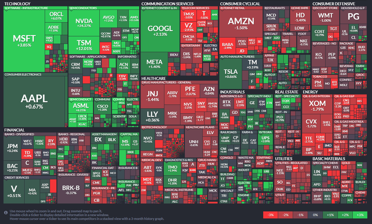 더불어 엔비디아와 협력을 맺은 서비스나우(+5.82%)도 강세를 보임. 오라클(+6.07%)과 어도비(+7.19%)도 AI 산업 성장의 수혜를 받을 수 있다는 점이 부각되자 강세. 특히 포토샵에 AI가 도입돼 매출 확대 기대가 부각된 어디비의 강세가 뚜렷.