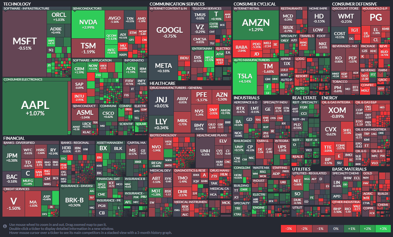 테슬라(+4.14%)는 머스크의 중국 방문 소식에 힘입어 상승. 시장은 상하이 공장에서 연간 45만대의 차량 생산 계획을 늘리는지 여부와 자율 주행 관련 출시를 중국 정부가 허가할지 여부 등에 주목. 포드(+4.14%)는 테슬라와의 충전 시설 협력에 이어 제프리스가 매수로 투자의견을 상향 조정한 데 힘입어 상승. 전기차 충전 관련 업체인 차지포인트(+14.13%)는 BOA가 투자의견 상향하자 강세. 넷플릭스(+3.72%)는 할리우드 작가들의 파업이 종료되었다는 소식에 강세.