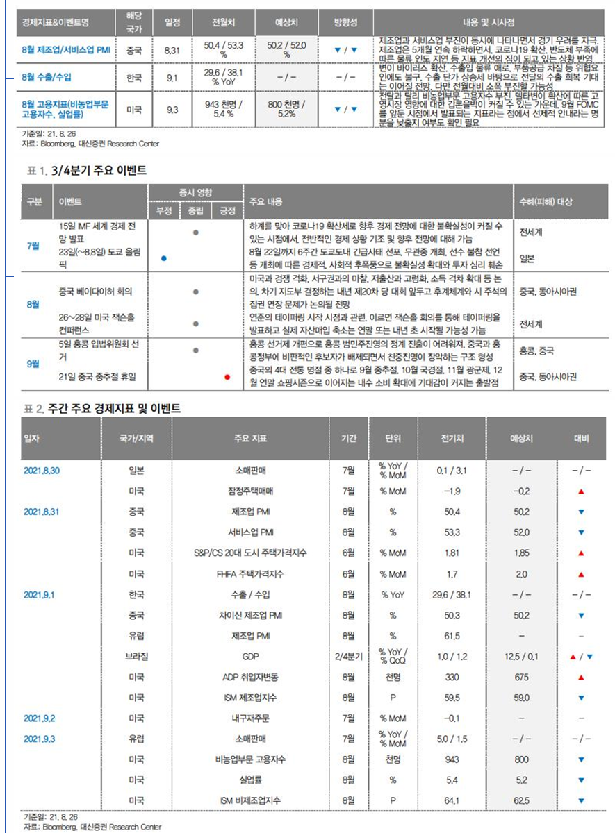 이제 시장은 9월 테이퍼링 발표를 가늠할 수 있는 8월 고용지표에 관심이 쏠리고 있다. 이 때문에 이번 주 고용 보고서에 앞서 발표되는 ADP 민간 고용이나, 주간 신규 실업보험 청구자 수에도 시장의 관심이 쏠릴 것으로 보인다. 모두 노동부 고용 보고서 이전에 고용 상황을 가늠해줄 수 있는 지표들이다.
