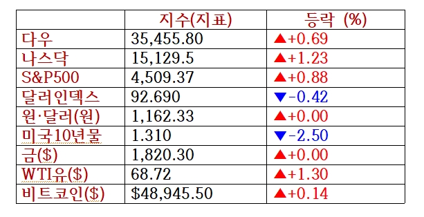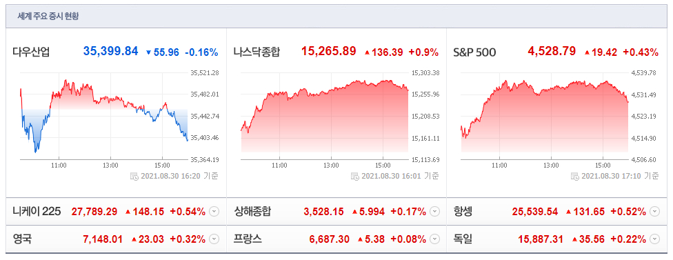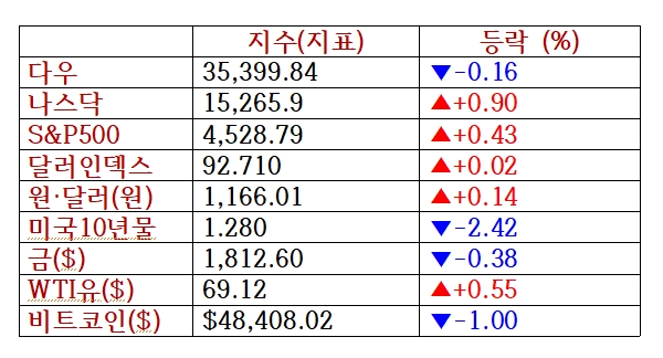반면 뉴욕증권거래소(NYSE)에서 다우존스30산업평균지수는 전장보다 55.96포인트(0.16%) 하락한 35,399.84로 장을 마감해 혼조세를 나타냈다.