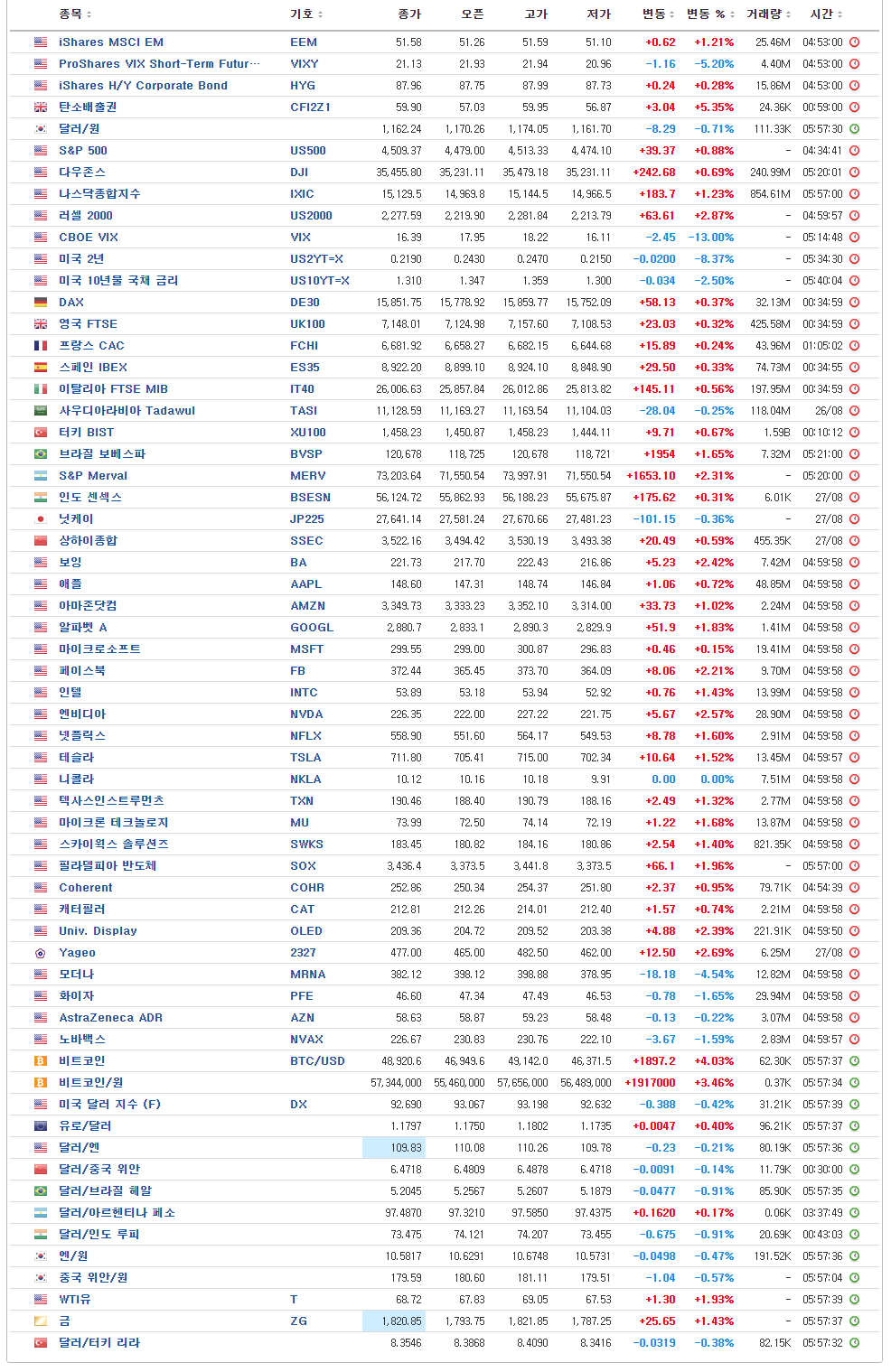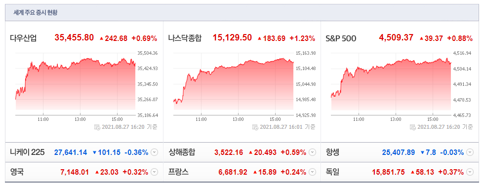 현지 시각으로 27일 뉴욕증권거래소(NYSE)에서 다우존스30산업평균지수는 전장보다 242.68포인트(0.69%) 오른 35,455.80으로 장을 마감했다.